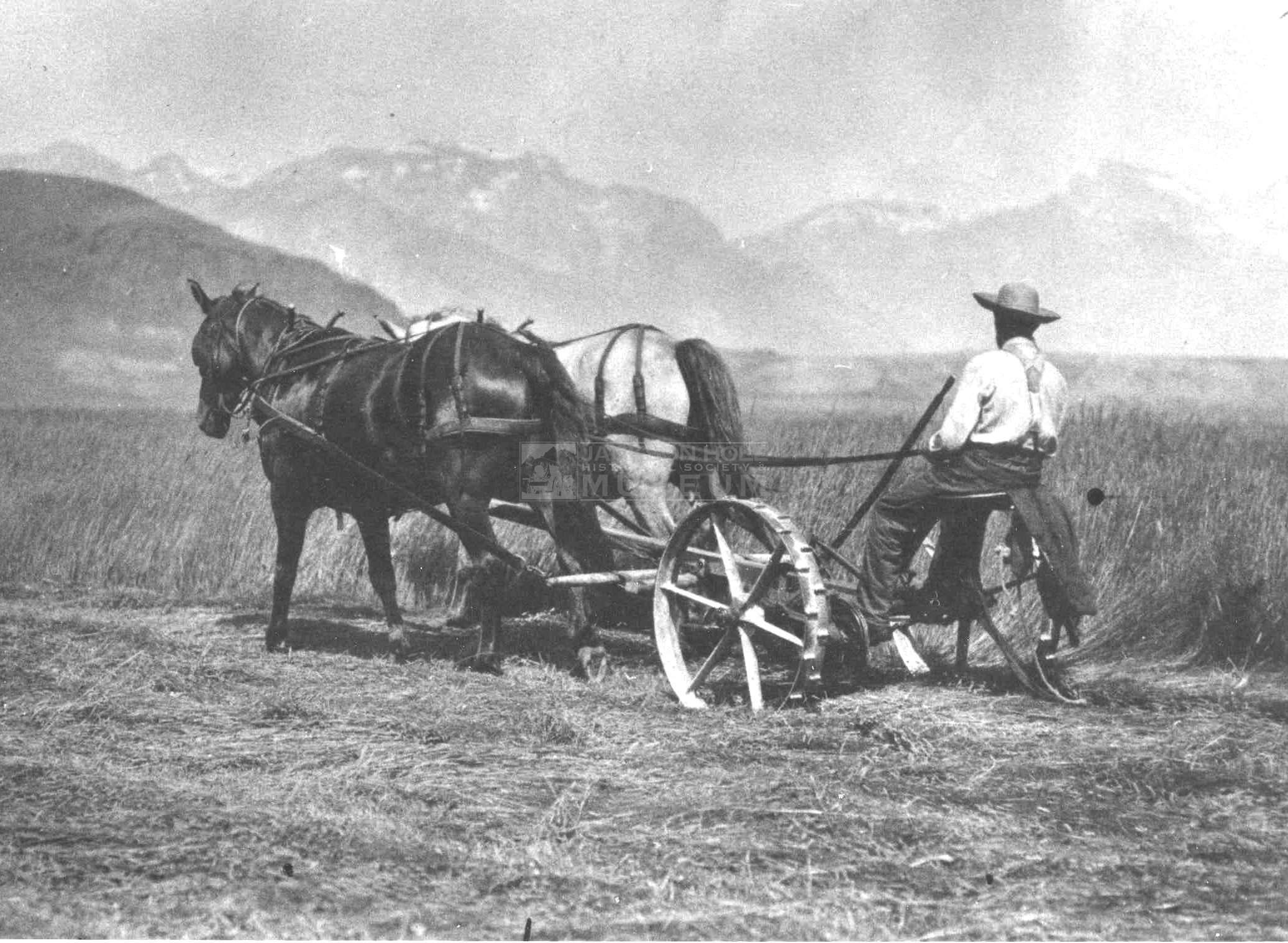 Homesteading farming ← Previous Joseph Infanger haying with a horse-drawn mower on his homestead, on what is now the National Elk Refuge
