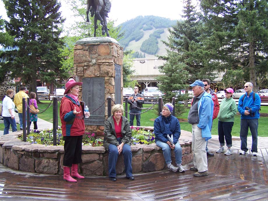 Linda Walker meets walking tour folks at the center of the Town Square