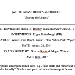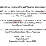 Sheila Bricher-Wade has a long and interesting personal and professional life around issues of historic preservation including confronting Park Administrators and organizing grass root preservation efforts. For many years (starting in 1980), she worked for the WY State Office of Historic Preservation (SHPO) handling Wyoming nominations to the National Historic Register. Lots of her work centered in the Grand Teton National Park where she helped to organize Historic Districts within the park deserving of protection. She also organized volunteer work parties over several decades of work in the park preserving historic structures. As she articulates, SHPO had a list of places in the Grand Teton Park that they (SHPO staff) were ‘willing to die for’ in order to protect, which included White Grass. Sheila also describes the process of searching to find a ‘repurpose’ for White Grass, an important component of preservation.