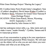 Frank Galey’s interview was conducted by Jo Anne Byrd from the Jackson Hole Historical Society and Museum. The document attached is a condensed summary of his oral history with some names and events omitted. Topics included: early White Grass homesteading history; Frank’s mother’s involvement at the BAR BC and later marrying Harold Hammond, owner of White Grass; Frank leaving Princeton University to run the ranch after Hammond died in 1938; ranch expansion for dudes beyond 3 cabins and a tent; poker earnings to pay the ranch mortgage; gambling in Jackson; impact of WWII; and selling the ranch to the park in 1955.