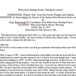 Brain Cleary was brought to White Grass by his mother at about age 9. He returned many years as his mother stayed summers in the Homestead Cabin/Cleary Cabin as father visited periodically. At age 15, Brian became a wrangler for Frank. In his interview, Brain describes the life and responsibilities of a wrangler, always enjoying the young teenage dude girls, his first love affair with his horse Candy, leading many pack trips into the wilderness and growing up fast but loving the responsibility. He discusses the use of alcohol on the ranch, seeing the ranch operate during Frank’s two marriages, Frank’s abuse of his body, financial issues and the legacy of White Grass. According to Brian, “It was my most meaningful 12 years (ever)… it molded me… when I worked in NYC, I would say the skyscrapers were my Tetons… this (the ranch) was my home – body and soul… it was probably my most relaxing time of my life… I think my mother felt the same way.” Historical photos of significance are included.