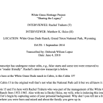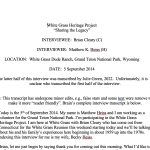 Pam Holtman, historian for the National Park Service, worked for Grand Teton National Park from 2001 to 2006 during which time she was involved in doing an initial cultural assessment of White Grass and facilitating all the documents needed to forge a partnership between the NPS and the National Trust for Historical Preservation. In her oral history, she further documents how a new park superintendent broke precedent and began protecting park historic sites including White Grass. She further details the struggles across divisions within the NPS, working with local preservation boards and state preservation officials, White Grass Alumni and preservation architects to successfully: (1) rehabilitate White Grass as a NPS training center teaching historic preservation skills and (2) establish the Western Center for Historic Preservation (NPS) which managed the rehabilitation and now oversees the training program. On a personal note, she speaks to her professional satisfaction working on such a project and being present for the ribbon cutting ceremony at the ranch in 2016.